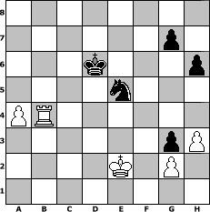 Partie-Notation im PGN-Format [Event "Chess for beginners"] [Site "www.mySchach.de"] [Date "2006.09.27"] [Round "1"] [Board "3"] [White "hirnlos"] [Black "mickey"] [ECO "C68"] [WhitemyELO "1472"] [BlackmyELO "1519"] [Result "1-0"] [TimeControl "10/2592000"] [WhiteDays "26"] [BlackDays "29"] [MySchachNr "28967"] 1. e4 e5 2. Nf3 Nc6 3. Bb5 a6 4. Bc4 b5 5. Bd5 Nf6 6. Bxc6 dxc6 7. Nxe5 Bd6 8. Nxc6 Qd7 9. Nd4 Nxe4 10. Qe2 Qe7 11. Nc6 Qe6 12. Nd4 Qe7 13. Nf5 Bxf5 14. d3 Nf6 15. Nc3 Qxe2+ 16. Nxe2 O-O 17. Bg5 h6 18. Be3 Ng4 19. Bd2 Rfe8 20. h3 Nf6 21. Be3 Re7 22. O-O Rae8 23. Nd4 Bd7 24. Bd2 c5 25. Nf3 Re2 26. Rfc1 Bc6 27. Be3 Nd5 28. Re1 R2xe3 29. fxe3 Nxe3 30. Rac1 Bf4 31. Re2 Bg3 32. Nd2 f5 33. Nf1 f4 34. Nxg3 fxg3 35. Rce1 Nxc2 36. Rxe8+ Bxe8 37. Rxe8+ Kf7 38. Ra8 Nb4 39. Kf1 Nxd3 40. Rxa6 Nxb2 41. Ra5 b4 42. Rxc5 Nd3 43. Rc4 Ke6 44. Ke2 Ne5 45. Rxb4 Kd6 46. a4 1-0 Stellungs-Notation im FEN-Format 8/6p1/3k3p/4n3/PR6/6pP/4K1P1/8 - - - 0 46 Geschlagene Figuren Weiss: Geschlagene Figuren Schwarz: Klicken Sie auf eine geschlagene Figur um den gewünschten Zug darzustellen!