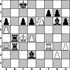 Partie-Notation im PGN-Format [Event "Aljechin - zum F"] [Site "www.mySchach.de"] [Date "2008.10.11"] [Round "1"] [White "Andreas"] [Black "Andylein1989"] [ECO "B03"] [WhitemyELO "1554"] [BlackmyELO "1688"] [Result "0-1"] [TimeControl "10/1728000"] [WhiteDays "73"] [BlackDays "80"] [MySchachNr "48754"] 1. e4 Nf6 2. e5 Nd5 3. d4 d6 4. c4 Nb6 5. exd6 exd6 6. Nf3 Be7 7. b4 Bf6 8. Bb2 Qe7+ 9. Qe2 Nc6 10. a4 Nxb4 11. Qxe7+ Kxe7 12. a5 Nc2+ 13. Kd2 Nxa1 14. Bxa1 Na4 15. Bd3 Rb8 16. Re1+ Kd8 17. Na3 Bd7 18. h3 h6 19. Bc2 a6 20. Bxa4 Bxa4 21. Kd3 Bd7 22. Nc2 Bf5+ 23. Kc3 Re8 24. Ne3 Be4 25. Nd2 Bg6 26. Rd1 Bh4 27. Rf1 Bxf2 28. Nd5 Be1 29. Bb2 b5 30. Bc1 c6 31. Nf4 Re3+ 32. Kb4 bxc4+ 33. Kxc4 Reb3 34. Ba3 Bxd2 35. Ne6+ Kc8 36. Rf3 R8b4+ 0-1 Stellungs-Notation im FEN-Format 2k5/5pp1/p1ppN1bp/P7/1rKP4/Br3R1P/3b2P1/8 - - - 4 37 Geschlagene Figuren Weiss: Geschlagene Figuren Schwarz: Klicken Sie auf eine geschlagene Figur um den gewünschten Zug darzustellen!