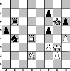Partie-Notation im PGN-Format [Event "Spass am Schach"] [Site "www.mySchach.de"] [Date "2004.03.24"] [Round "1"] [White "karpov"] [Black "Phantasos"] [ECO "C17"] [WhitemyELO "1994"] [BlackmyELO "1796"] [Result "1/2-1/2"] [TimeControl "10/864000"] [WhiteDays "32"] [BlackDays "44"] [MySchachNr "3280"] 1. e4 e6 2. d4 d5 3. Nc3 Bb4 4. e5 c5 5. Bd2 Ne7 6. a3 Bxc3 7. Bxc3 Nbc6 8. Nf3 cxd4 9. Nxd4 Nxe5 10. Nxe6 Bxe6 11. Bxe5 O-O 12. Bd3 Nc6 13. Bg3 Re8 14. O-O Qf6 15. Rb1 Bf5 16. Qf3 Bxd3 17. Qxf6 gxf6 18. cxd3 Rac8 19. Bf4 Nd4 20. Be3 Nb3 21. Bh6 Re6 22. f3 f5 23. Bg5 h6 24. Bf4 Nd4 25. Kh1 Ne2 26. Bd2 Rc2 27. Rfd1 Kh7 28. a4 Kg6 29. a5 b6 30. axb6 Rxb6 31. b4 d4 32. h3 Ra6 33. Be1 Raa2 34. Ra1 Rxa1 35. Rxa1 Nf4 36. Bg3 Nxd3 37. Ra6+ Kg5 38. h4+ Kh5 39. Rd6 Nxb4 40. Bf4 Rc6 41. Rxd4 a5 42. Bd2 Rb6 43. Kh2 Kg6 44. Kg3 1/2-1/2 Stellungs-Notation im FEN-Format 8/5p2/1r4kp/p4p2/1n1R3P/5PK1/3B2P1/8 - - - 5 44 Geschlagene Figuren Weiss: ![]() ![]() ![]() ![]() ![]() ![]() ![]() ![]() ![]() ![]() ![]() ![]() ![]() ![]() ![]() Geschlagene Figuren Schwarz: ![]() ![]() ![]() ![]() ![]() ![]() ![]() ![]() ![]() ![]() ![]() ![]() ![]() ![]() ![]() Klicken Sie auf eine geschlagene Figur um den gewünschten Zug darzustellen!