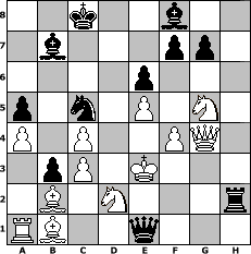 Partie-Notation im PGN-Format [Event "Herbstturnier 2022"] [Site "www.mySchach.de"] [Date "2022.09.26"] [Round "1"] [White "muellerh"] [Black "Leon"] [ECO "B01"] [WhitemyELO "1540"] [BlackmyELO "1632"] [Result "0-1"] [TimeControl "10/1728000"] [WhiteDays "77"] [BlackDays "80"] [MySchachNr "127244"] 1. e4 d5 2. e5 d4 3. f4 c5 4. Bc4 e6 5. Nf3 Ne7 6. d3 Nf5 7. g4 Nh4 8. Qe2 h6 9. O-O a6 10. g5 hxg5 11. Nxg5 b5 12. Bb3 Bb7 13. Qg4 Qe7 14. Nd2 Nf5 15. Ndf3 Nd7 16. c4 dxc3 17. bxc3 a5 18. a4 c4 19. dxc4 Qc5+ 20. Rf2 b4 21. Bb2 Qc6 22. Qg2 Nc5 23. Bc2 Ne3 24. Qg3 b3 25. Bb1 O-O-O 26. Rd2 Rxd2 27. Nxd2 Qh1+ 28. Kf2 Ng4+ 29. Qxg4 Rxh2+ 30. Ke3 Qe1+ 0-1 Stellungs-Notation im FEN-Format 2k2b2/1b3pp1/4p3/p1n1P1N1/P1P2PQ1/1pP1K3/1B1N3r/RB2q3 - - - 2 31 Geschlagene Figuren Weiss: Geschlagene Figuren Schwarz: Klicken Sie auf eine geschlagene Figur um den gewünschten Zug darzustellen!