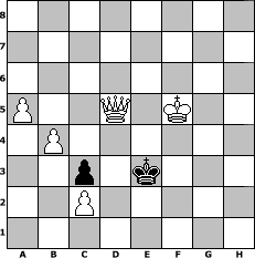 Partie-Notation im PGN-Format [Event "Valjaux"] [Site "www.mySchach.de"] [Date "2025.07.23"] [Round "1"] [White "skuehnel"] [Black "Achimkogge"] [ECO "A02"] [WhitemyELO "1366"] [BlackmyELO "1216"] [Result "1-0"] [TimeControl "10/2592000"] [WhiteDays "129"] [BlackDays "144"] [MySchachNr "133532"] 1. f4 e6 2. Nf3 Bc5 3. e3 d6 4. Nc3 h6 5. a3 c6 6. d4 Bb6 7. Bd3 g6 8. O-O Nf6 9. e4 Ng4 10. e5 dxe5 11. fxe5 g5 12. h3 Nxe5 13. Nxe5 Bxd4+ 14. Kh1 Bxe5 15. Be3 a6 16. Qh5 Qe7 17. Ne4 Nd7 18. Rf2 Nf6 19. Nxf6+ Bxf6 20. Raf1 Bd7 21. Rxf6 O-O-O 22. Rxf7 Qd6 23. R1f6 b5 24. Rxh6 Rxh6 25. Qxh6 c5 26. Bxg5 Re8 27. Bg6 Qd1+ 28. Kh2 Qd6+ 29. Bf4 e5 30. Qg7 exf4 31. Rxd7 Qxd7 32. Qxd7+ Kxd7 33. Bxe8+ Kxe8 34. g4 Kf7 35. Kg2 Kf6 36. Kf3 Kg5 37. h4+ Kxh4 38. Kxf4 c4 39. b4 c3 40. g5 Kh5 41. Kf5 a5 42. bxa5 Kh4 43. g6 Kg3 44. g7 Kf3 45. g8=Q Ke3 46. Qd5 b4 47. axb4 1-0 Stellungs-Notation im FEN-Format 8/8/8/P2Q1K2/1P6/2p1k3/2P5/8 - - - 0 47 Geschlagene Figuren Weiss: Geschlagene Figuren Schwarz: Klicken Sie auf eine geschlagene Figur um den gewünschten Zug darzustellen!
