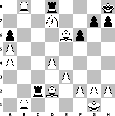 Partie-Notation im PGN-Format [Event "unter uns Nr. 30 (Weihnachtsturnier)"] [Site "www.mySchach.de"] [Date "2015.12.21"] [Round "2"] [White "reisinger"] [Black "Haneken"] [ECO "A40"] [WhitemyELO "1486"] [BlackmyELO "1087"] [Result "1-0"] [TimeControl "10/2592000"] [WhiteDays "89"] [BlackDays "89"] [MySchachNr "101765"] 1. d4 b6 2. c4 Ba6 3. e3 Nc6 4. Nf3 Na5 5. Qa4 c6 6. b4 b5 7. cxb5 cxb5 8. Qxa5 Qxa5 9. bxa5 Rc8 10. Bd2 e6 11. a4 Rb8 12. Na3 Bxa3 13. Rxa3 b4 14. Rb3 Nf6 15. Bxa6 O-O 16. O-O Ne4 17. Bxb4 Rfe8 18. Bb5 Red8 19. Ne5 Nd2 20. Bxd2 a6 21. Bc4 f6 22. Nxd7 Rbc8 23. Bxe6+ Kh8 24. Rfb1 Rc2 25. Rb8 1-0 Stellungs-Notation im FEN-Format 1R1r3k/3N2pp/p3Bp2/P7/P2P4/4P3/2rB1PPP/1R4K1 - - - 4 25 Geschlagene Figuren Weiss: Geschlagene Figuren Schwarz: Klicken Sie auf eine geschlagene Figur um den gewünschten Zug darzustellen!