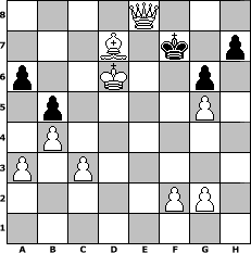 Partie-Notation im PGN-Format [Event "Aprilturnier"] [Site "www.mySchach.de"] [Date "2016.04.22"] [Round "1"] [White "hape50"] [Black "augustus"] [ECO "C20"] [WhitemyELO "1278"] [BlackmyELO "1276"] [Result "1-0"] [TimeControl "10/1728000"] [WhiteDays "116"] [BlackDays "038"] [MySchachNr "103360"] 1. e4 e5 2. d3 Nc6 3. a3 Bc5 4. Nf3 d6 5. h3 Nf6 6. c3 Bd7 7. Be2 O-O 8. b4 Bb6 9. Bb2 Nh5 10. Bc1 f5 11. exf5 Nf4 12. Bxf4 exf4 13. O-O Bxf5 14. Nbd2 d5 15. d4 Rf6 16. Nh2 Qd7 17. Ng4 Rg6 18. Nf3 Bxg4 19. hxg4 Rf8 20. Nh4 Re6 21. Nf3 Rh6 22. Ng5 Qe7 23. Nh3 Nd8 24. Bf3 c6 25. Re1 Qd6 26. Qd3 Ne6 27. Ra2 Bd8 28. Re5 Ng5 29. Nxg5 Bxg5 30. Rxg5 Qe7 31. Rh5 Qe1+ 32. Kh2 Qe6 33. Re2 Qd7 34. Kg1 Re8 35. Rhe5 Rhe6 36. Qf5 g6 37. Qxf4 Qd6 38. Qg5 b5 39. Qh6 Qf8 40. Qxf8+ Kxf8 41. Kh2 Kf7 42. g5 a6 43. Kg3 Rxe5 44. Rxe5 Rxe5 45. dxe5 Ke6 46. Kf4 Ke7 47. Bg4 Ke8 48. e6 Ke7 49. Ke5 Kd8 50. Kd6 Ke8 51. Kxc6 Ke7 52. Kxd5 Ke8 53. Kd6 Kd8 54. e7+ Ke8 55. Bd7+ Kf7 56. e8=Q+ 1-0 Stellungs-Notation im FEN-Format 4Q3/3B1k1p/p2K2p1/1p4P1/1P6/P1P5/5PP1/8 - - - 0 56 Geschlagene Figuren Weiss: Geschlagene Figuren Schwarz: Klicken Sie auf eine geschlagene Figur um den gewünschten Zug darzustellen!