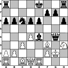 Partie-Notation im PGN-Format [Event "Scottish Open"] [Site "www.mySchach.de"] [Date "2007.10.22"] [Round "1"] [White "bernhard"] [Black "Juri"] [ECO "A06"] [WhitemyELO "1614"] [BlackmyELO "1485"] [Result "0-1"] [TimeControl "10/864000"] [WhiteDays "28"] [BlackDays "30"] [MySchachNr "39156"] 1. Nf3 d5 2. e3 a6 3. d4 Nc6 4. g3 Bg4 5. Be2 e6 6. O-O Qf6 7. c3 Bd6 8. Qb3 b6 9. Nbd2 Nge7 10. Qd1 Bh3 11. Re1 Nf5 12. e4 dxe4 13. Nxe4 Qe7 14. Nxd6+ cxd6 15. Ng5 Nxg3 16. hxg3 Bf5 17. g4 h6 18. Nh3 Qh4 19. Kg2 Be4+ 20. Bf3 Qxg4+ 0-1 Stellungs-Notation im FEN-Format r3k2r/5pp1/ppnpp2p/8/3Pb1q1/2P2B1N/PP3PK1/R1BQR3 - kq - 0 21 Geschlagene Figuren Weiss: Geschlagene Figuren Schwarz: Klicken Sie auf eine geschlagene Figur um den gewünschten Zug darzustellen!