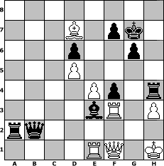 Partie-Notation im PGN-Format [Event "In diesem Sommer gehts noch mal heiss her"] [Site "www.mySchach.de"] [Date "2024.07.20"] [Round "1"] [White "Ziegert"] [Black "TomG"] [ECO "B43"] [WhitemyELO "2042"] [BlackmyELO "1515"] [Result "0-1"] [TimeControl "10/2592000"] [WhiteDays "18"] [BlackDays "77"] [MySchachNr "132113"] 1. e4 c5 2. Nf3 e6 3. d4 cxd4 4. Nxd4 a6 5. Nc3 Qc7 6. Qg4 Nf6 7. Qg3 d6 8. a3 Nbd7 9. Be2 b5 10. Be3 Bb7 11. f3 Rc8 12. O-O h5 13. Rfc1 h4 14. Qh3 Be7 15. Rf1 Nc5 16. g4 Nh7 17. Rad1 O-O 18. Qg2 Ng5 19. Kh1 Bf6 20. Bd3 Rfe8 21. Qf2 Qe7 22. Qd2 Red8 23. Kg2 g6 24. Qf2 e5 25. Nde2 h3+ 26. Kh1 Nge6 27. Qg3 Kg7 28. Qxh3 Rh8 29. Qg2 Bg5 30. Bg1 Rh4 31. b4 Nd7 32. a4 bxa4 33. Nxa4 Rch8 34. c4 Nf4 35. Nxf4 Bxf4 36. Nc3 Rh3 37. Nd5 Bxd5 38. cxd5 Qh4 39. Rd2 Nf8 40. Bxa6 Nh7 41. Rb2 Rg3 42. Qe2 Ng5 43. b5 Qh6 44. b6 Nh3 45. Bf2 Nxf2+ 46. Rxf2 Rh3 47. Rc2 Be3 48. f4 Bxb6 49. Rf3 exf4 50. Qg2 Rh4 51. Rb2 Bd4 52. Rd2 Be3 53. Ra2 Bd4 54. Rd2 Ba7 55. Rc2 Qg5 56. Qf1 Qxg4 57. Bc8 Qh5 58. h3 Qe5 59. Bd7 Be3 60. Kg2 Ra8 61. Re2 Ra1 62. Re1 Ra2+ 63. Kh1 Qb2 0-1 Stellungs-Notation im FEN-Format 8/3B1pk1/3p2p1/3P4/4Pp1r/4bR1P/rq6/4RQ1K - - - 11 64 Geschlagene Figuren Weiss: Geschlagene Figuren Schwarz: Klicken Sie auf eine geschlagene Figur um den gewünschten Zug darzustellen!