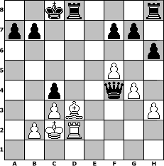 Partie-Notation im PGN-Format [Event "Entdeckung der Langsamkeit 2"] [Site "www.mySchach.de"] [Date "2012.02.18"] [Round "1"] [White "bavaria"] [Black "Andylein1989"] [ECO "C20"] [WhitemyELO "1315"] [BlackmyELO "1568"] [Result "0-1"] [TimeControl "10/3456000"] [WhiteDays "159"] [BlackDays "120"] [MySchachNr "79987"] 1. e4 e5 2. d3 h6 3. a3 Nf6 4. h3 Bc5 5. Be3 Bb6 6. Qd2 d5 7. Nc3 d4 8. Nd5 dxe3 9. fxe3 Nxd5 10. exd5 Qxd5 11. e4 Qd4 12. O-O-O Be6 13. Nf3 Qd6 14. Qc3 Nc6 15. Be2 O-O-O 16. Nh4 Nd4 17. Qd2 Bc5 18. c3 Nb3+ 19. Kc2 Nxd2 20. Rxd2 Bxa3 21. Rb1 Bc5 22. Rbd1 Be3 23. Nf5 Bxf5 24. exf5 Bxd2 25. Rxd2 c5 26. g4 e4 27. Kc1 exd3 28. Bxd3 Qf4 29. Kc2 c4 0-1 Stellungs-Notation im FEN-Format 2kr3r/pp3pp1/7p/5P2/2p2qP1/2PB3P/1PKR4/8 - - - 0 30 Geschlagene Figuren Weiss: Geschlagene Figuren Schwarz: Klicken Sie auf eine geschlagene Figur um den gewünschten Zug darzustellen!