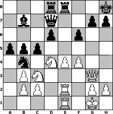 Partie-Notation im PGN-Format [Event "Jagdvariante - die Zweite"] [Site "www.mySchach.de"] [Date "2006.06.07"] [Round "1"] [White "nogumo"] [Black "HPB2005"] [ECO "C70"] [WhitemyELO "1863"] [BlackmyELO "1945"] [Result "1/2-1/2"] [TimeControl "10/2592000"] [WhiteDays "84"] [BlackDays "73"] [MySchachNr "25950"] 1. e4 e5 2. Nf3 Nc6 3. Bb5 a6 4. Ba4 b5 5. Bb3 Na5 6. d4 exd4 7. Qxd4 Nxb3 8. axb3 Bb7 9. O-O Ne7 10. Bg5 Nc6 11. Qe3 Be7 12. Nc3 Bxg5 13. Nxg5 O-O 14. f4 f6 15. Nf3 Re8 16. Rae1 d6 17. Nh4 Qd7 18. Nf5 a5 19. Qg3 Nb4 20. Re2 Rad8 21. Rfe1 Kh8 22. Nd4 c5 1/2-1/2 Stellungs-Notation im FEN-Format 3rr2k/1b1q2pp/3p1p2/ppp5/1n1NPP2/1PN3Q1/1PP1R1PP/4R1K1 - - - 0 23 Geschlagene Figuren Weiss: ![]() ![]() ![]() ![]() ![]() ![]() ![]() ![]() ![]() ![]() ![]() ![]() ![]() ![]() ![]() Geschlagene Figuren Schwarz: ![]() ![]() ![]() ![]() ![]() ![]() ![]() ![]() ![]() ![]() ![]() ![]() ![]() ![]() ![]() Klicken Sie auf eine geschlagene Figur um den gewünschten Zug darzustellen!