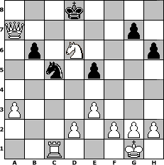 Partie-Notation im PGN-Format [Event "Wrixum - Open die III."] [Site "www.mySchach.de"] [Date "2006.10.24"] [Round "1"] [White "reisinger"] [Black "Juri"] [ECO "D06"] [WhitemyELO "1606"] [BlackmyELO "1536"] [Result "1-0"] [TimeControl "10/3456000"] [WhiteDays "158"] [BlackDays "156"] [MySchachNr "29489"] 1. d4 d5 2. c4 Nf6 3. Nc3 c6 4. Bf4 Bf5 5. e3 dxc4 6. Bxc4 Qa5 7. Nge2 Qb4 8. b3 Ne4 9. a3 Qb6 10. O-O c5 11. Nd5 Qc6 12. Nc7+ Kd8 13. Nxa8 Nd7 14. dxc5 Nexc5 15. Bxf7 e6 16. Nd4 Qe4 17. Rc1 e5 18. Bg5+ Kc8 19. b4 b6 20. bxc5 Bxc5 21. Nb5 Qxa8 22. Nd6+ Kc7 23. Nxf5 h6 24. Be7 Qc6 25. Bd6+ Kb7 26. Bd5 Rc8 27. Bxc6+ Rxc6 28. Bxc5 Nxc5 29. Qd5 Kc7 30. Qf7+ Kb8 31. Rfd1 Rc7 32. Rd8+ Rc8 33. Rxc8+ Kxc8 34. Nd6+ Kd8 35. Qxa7 1-0 Stellungs-Notation im FEN-Format 3k4/Q5p1/1p1N3p/2n1p3/8/P3P3/3P1PPP/2R3K1 - - - 0 35 Geschlagene Figuren Weiss: Geschlagene Figuren Schwarz: Klicken Sie auf eine geschlagene Figur um den gewünschten Zug darzustellen!