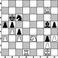Partie-Notation im PGN-Format [Event "Sweety Tunier"] [Site "www.mySchach.de"] [Date "2006.02.28"] [Round "1"] [White "Andylein1989"] [Black "Falcor"] [ECO "C50"] [WhitemyELO "1660"] [BlackmyELO "1422"] [Result "1-0"] [TimeControl "10/2592000"] [WhiteDays "105"] [BlackDays "081"] [MySchachNr "22974"] 1. e4 e5 2. Nf3 Nc6 3. Bc4 h6 4. d4 exd4 5. Nxd4 Nxd4 6. Qxd4 d6 7. O-O Nf6 8. Nc3 c5 9. Qd3 Be6 10. Bxe6 fxe6 11. Qb5+ Qd7 12. Qxd7+ Nxd7 13. Rd1 O-O-O 14. Bf4 Be7 15. Bxd6 Bf6 16. Bf4 Ne5 17. Rxd8+ Rxd8 18. Nb5 Nc6 19. c3 Be7 20. Na3 e5 21. Be3 a6 22. h3 b5 23. f4 exf4 24. Bxf4 g5 25. Be3 c4 26. Bb6 Rd2 27. b4 Kb7 28. Be3 Re2 29. Bd4 Rxe4 30. Bg7 h5 31. Rd1 Kb6 32. Nb1 a5 33. Nd2 Re6 34. a3 Re3 35. Nf3 g4 36. Nd4 g3 37. Nf5 Bg5 38. Nxe3 1-0 Stellungs-Notation im FEN-Format 8/6B1/1kn5/pp4bp/1Pp5/P1P1N1pP/6P1/3R2K1 - - - 0 38 Geschlagene Figuren Weiss: Geschlagene Figuren Schwarz: Klicken Sie auf eine geschlagene Figur um den gewünschten Zug darzustellen!
