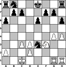 Partie-Notation im PGN-Format [Event "Schon wieder."] [Site "www.mySchach.de"] [Date "2017.10.12"] [Round "1"] [White "Knight"] [Black "Rabenvogel"] [ECO "D00"] [WhitemyELO "1133"] [BlackmyELO "1529"] [Result "0-1"] [TimeControl "10/2592000"] [WhiteDays "60"] [BlackDays "60"] [MySchachNr "109905"] 1. d4 d5 2. e4 dxe4 3. Nc3 Nf6 4. f3 exf3 5. Qxf3 Qxd4 6. Be3 Qb4 7. O-O-O Qg4 8. Qf2 a6 9. Be2 Qe6 10. Nf3 Ng4 11. Qg1 Qxe3+ 12. Qxe3 Nxe3 13. Rdg1 Bf5 14. Bd3 Bxd3 15. cxd3 e6 16. h4 Bb4 17. g4 Bxc3 18. bxc3 h6 0-1 Stellungs-Notation im FEN-Format rn2k2r/1pp2pp1/p3p2p/8/6PP/2PPnN2/P2P4/2K3RR - kq - 0 19 Geschlagene Figuren Weiss: ![]() ![]() ![]() ![]() ![]() ![]() ![]() ![]() ![]() ![]() ![]() ![]() ![]() ![]() ![]() Geschlagene Figuren Schwarz: ![]() ![]() ![]() ![]() ![]() ![]() ![]() ![]() ![]() ![]() ![]() ![]() ![]() ![]() ![]() Klicken Sie auf eine geschlagene Figur um den gewünschten Zug darzustellen!