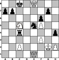 Partie-Notation im PGN-Format [Event "Trainingslager II"] [Site "www.mySchach.de"] [Date "2011.05.24"] [Round "2"] [White "reisender"] [Black "Master1"] [ECO "A01"] [WhitemyELO "1322"] [BlackmyELO "1331"] [Result "1-0"] [TimeControl "10/1728000"] [WhiteDays "20"] [BlackDays "20"] [MySchachNr "74169"] 1. b3 e5 2. Bb2 d6 3. e4 Be6 4. d4 d5 5. dxe5 c6 6. exd5 Qxd5 7. Nd2 Nd7 8. Qe2 Ne7 9. f4 O-O-O 10. O-O-O Nf5 11. Ngf3 h6 12. Qf2 Bc5 13. Qe1 Ne3 14. Qg3 Nxd1 15. Kxd1 Rhg8 16. Bc4 Qxf3+ 17. gxf3 Bxc4 18. bxc4 Be3 19. Bc3 Nc5 20. f5 Na4 21. Ke2 Nxc3+ 22. Kxe3 Nxa2 23. Ra1 Nb4 24. Rc1 c5 25. Qe1 Rge8 26. Kf4 f6 27. e6 Rd4+ 28. Kg3 h5 29. Ne4 Nc6 30. Rd1 Red8 31. Rxd4 Rxd4 32. Nxc5 h4+ 33. Kg2 Ne5 34. e7 Rxc4 35. e8=Q+ 1-0 Stellungs-Notation im FEN-Format 2k1Q3/pp4p1/5p2/2N1nP2/2r4p/5P2/2P3KP/4Q3 - - - 0 35 Geschlagene Figuren Weiss: Geschlagene Figuren Schwarz: Klicken Sie auf eine geschlagene Figur um den gewünschten Zug darzustellen!
