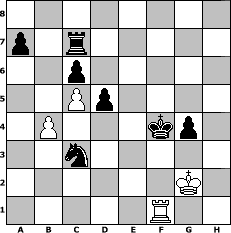 Partie-Notation im PGN-Format [Event "Schnelles Pfingst-Turnier"] [Site "www.mySchach.de"] [Date "2011.06.12"] [Round "1"] [White "Mestengo"] [Black "Rotstift10"] [ECO "A00"] [WhitemyELO "1501"] [BlackmyELO "1567"] [Result "1-0"] [TimeControl "10/864000"] [WhiteDays "10"] [BlackDays "00"] [MySchachNr "74529"] 1. a4 e5 2. h4 Nf6 3. e3 d5 4. d4 Bb4+ 5. c3 Bd6 6. Nf3 Bg4 7. b4 e4 8. Be2 exf3 9. Bxf3 Bxf3 10. Qxf3 O-O 11. Nd2 Re8 12. g3 c6 13. Nb3 Ne4 14. Bd2 Re6 15. Qg2 Rf6 16. f3 Nxg3 17. Rg1 Rg6 18. Qh3 Qf6 19. f4 Ne4 20. Rxg6 Qxg6 21. Qc8+ Bf8 22. O-O-O Nd6 23. Qh3 h5 24. Nc5 Qg4 25. Qxg4 hxg4 26. Rg1 f5 27. Ne6 Nd7 28. h5 Nf6 29. a5 Nxh5 30. Rh1 g6 31. Kc2 Ne4 32. Nc5 Bxc5 33. dxc5 Nxd2 34. Kxd2 Kf7 35. Ke2 Kf6 36. Kf2 Re8 37. Ra1 g5 38. fxg5+ Kxg5 39. a6 Re7 40. Ra2 Nf6 41. axb7 Rxb7 42. Kg2 Ne4 43. Ra6 Rc7 44. Ra3 f4 45. exf4+ Kxf4 46. Ra1 Nxc3 47. Rf1+ 1-0 Stellungs-Notation im FEN-Format 8/p1r5/2p5/2Pp4/1P3kp1/2n5/6K1/5R2 - - - 1 47 Geschlagene Figuren Weiss: Geschlagene Figuren Schwarz: Klicken Sie auf eine geschlagene Figur um den gewünschten Zug darzustellen!