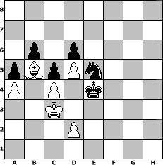 Partie-Notation im PGN-Format [Event "März 2019"] [Site "www.mySchach.de"] [Date "2019.02.18"] [Round "1"] [White "alibengali"] [Black "Rotstift10"] [ECO "E32"] [WhitemyELO "1700"] [BlackmyELO "1632"] [Result "1/2-1/2"] [TimeControl "10/1728000"] [WhiteDays "111"] [BlackDays "101"] [MySchachNr "114400"] 1. d4 Nf6 2. c4 e6 3. Nc3 Bb4 4. Qc2 Bxc3+ 5. bxc3 h6 6. e4 d6 7. Nf3 b6 8. Bd3 Bb7 9. O-O Nbd7 10. Bb2 c5 11. d5 e5 12. Nh4 Nf8 13. Nf5 Ng6 14. Nxg7+ Kf8 15. Nf5 Nf4 16. Bc1 Ng8 17. Bxf4 exf4 18. Qc1 f3 19. gxf3 Bc8 20. Qf4 Bxf5 21. Qxf5 Qg5+ 22. Qxg5 hxg5 23. Kh1 f6 24. Rg1 Ne7 25. Rg4 Kf7 26. Rag1 Rh5 27. f4 Rah8 28. R1g2 Rh3 29. Bf1 gxf4 30. Rxf4 Rxc3 31. Rfg4 Rh7 32. R4g3 Rxg3 33. fxg3 Ng6 34. a4 Ne5 35. Be2 Kg6 36. h4 Kh6 37. g4 Rg7 38. Kh2 Ng6 39. Rf2 Nxh4 40. Rxf6+ Rg6 41. Rxg6+ Nxg6 42. Kg3 Kg5 43. Kf3 Nh4+ 44. Ke3 Ng6 45. Kd3 Kf4 46. Bd1 Ne5+ 47. Kc3 Kxe4 48. Bc2+ Kf4 49. Bf5 Nxg4 50. Bd7 Ne5 51. Bb5 a5 52. Bc6 Ke3 53. Bb5 Ke4 1/2-1/2 Stellungs-Notation im FEN-Format 8/8/1p1p4/pBpPn3/P1P1k3/2K5/3P4/8 - - - 4 54 Geschlagene Figuren Weiss: Geschlagene Figuren Schwarz: Klicken Sie auf eine geschlagene Figur um den gewünschten Zug darzustellen!