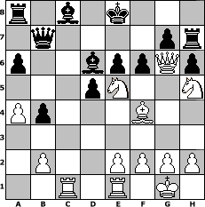 Partie-Notation im PGN-Format [Event "Godzilla Mannschaftsturnier 2013"] [Site "www.mySchach.de"] [Date "2013.08.15"] [Round "1"] [Board "3"] [White "martinus"] [Black "Winston"] [ECO "B28"] [WhitemyELO "1751"] [BlackmyELO "1499"] [Result "1-0"] [TimeControl "10/3456000"] [WhiteDays "40"] [BlackDays "40"] [MySchachNr "89753"] 1. e4 c5 2. Nf3 a6 3. d4 cxd4 4. c3 dxc3 5. Nxc3 h6 6. Bc4 e6 7. O-O Nf6 8. Re1 Qc7 9. Bb3 b5 10. e5 Nh7 11. Bc2 Nc6 12. a4 b4 13. Ne4 Nxe5 14. Nxe5 d5 15. Ng3 Nf6 16. Nh5 Nh7 17. Bxh7 Rxh7 18. Bf4 Bd6 19. Rc1 Qb7 20. Qg4 f6 21. Qg6+ 1-0 Stellungs-Notation im FEN-Format r1b1k3/1q4pr/p2bppQp/3pN2N/Pp3B2/8/1P2PPPP/2R1R1K1 - q - 1 21 Geschlagene Figuren Weiss: Geschlagene Figuren Schwarz: Klicken Sie auf eine geschlagene Figur um den gewünschten Zug darzustellen!