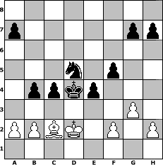 Partie-Notation im PGN-Format [Event "Adevnt Advent "] [Site "www.mySchach.de"] [Date "2018.12.04"] [Round "1"] [White "Robert"] [Black "pepo47"] [ECO "A05"] [WhitemyELO "1574"] [BlackmyELO "2127"] [Result "0-1"] [TimeControl "10/2592000"] [WhiteDays "024"] [BlackDays "120"] [MySchachNr "113657"] 1. Nf3 Nf6 2. d4 e6 3. g3 b5 4. Bg2 Bb7 5. O-O c5 6. c3 cxd4 7. cxd4 Be7 8. Nc3 b4 9. Na4 O-O 10. Nc5 Bd5 11. Re1 d6 12. e4 Bc6 13. d5 dxc5 14. dxc6 Qxd1 15. Rxd1 Nxc6 16. e5 Nd5 17. Bf4 Rad8 18. Bg5 Bxg5 19. Nxg5 Nxe5 20. Rac1 c4 21. Nf3 Nxf3+ 22. Bxf3 Nb6 23. Kf1 Rxd1+ 24. Bxd1 Rd8 25. Ke1 Rd4 26. Ke2 Kf8 27. Bc2 Ke7 28. Ke3 e5 29. Rd1 Rxd1 30. Bxd1 Nd5+ 31. Ke4 Ke6 32. Bc2 f5+ 33. Kf3 e4+ 34. Ke2 Ke5 35. Kd2 Kd4 0-1 Stellungs-Notation im FEN-Format 8/p5pp/8/3n1p2/1ppkp3/6P1/PPBK1P1P/8 - - - 4 36 Geschlagene Figuren Weiss: Geschlagene Figuren Schwarz: Klicken Sie auf eine geschlagene Figur um den gewünschten Zug darzustellen!