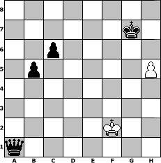Partie-Notation im PGN-Format [Event "Turnier in den M"] [Site "www.mySchach.de"] [Date "2014.02.19"] [Round "1"] [White "augustus"] [Black "Andylein1989"] [ECO "C23"] [WhitemyELO "1341"] [BlackmyELO "1339"] [Result "0-1"] [TimeControl "10/2592000"] [WhiteDays "01"] [BlackDays "30"] [MySchachNr "93086"] 1. e4 e5 2. Bc4 Bc5 3. Qf3 Nf6 4. d3 h6 5. Ne2 O-O 6. Qg3 Kh7 7. Be3 Bb6 8. O-O d6 9. f4 Bxe3+ 10. Qxe3 exf4 11. Nxf4 c6 12. d4 Qb6 13. b3 Na6 14. c3 Nc7 15. Nd2 Ne6 16. Bd3 Kg8 17. Rf3 Ng4 18. Qe1 Nxd4 19. cxd4 Qxd4+ 20. Kh1 Ne5 21. Rg3 g5 22. Nf3 Nxf3 23. gxf3 Kh8 24. Nh5 Qxd3 25. Rd1 Qa6 26. Rxd6 Be6 27. Qc3+ f6 28. Rxe6 Rad8 29. Rg1 Rd3 30. Qa1 Rxf3 31. e5 Qe2 32. Ng3 Qd2 33. exf6 Rxg3 34. f7+ Kh7 35. Rxg3 Qd5+ 36. Kg1 Qxe6 37. Qb1+ Kg7 38. Rf3 Rxf7 39. Rxf7+ Qxf7 40. Qb2+ Qf6 41. Qd2 Kg6 42. Qd7 Qa1+ 43. Kg2 Qxa2+ 44. Kg1 Qxb3 45. Qd6+ Kg7 46. Qe5+ Kf8 47. Qf6+ Qf7 48. Qxh6+ Kg8 49. Qh3 a5 50. Qc8+ Kg7 51. Qg4 b5 52. Qxg5+ Qg6 53. Qg2 Qxg2+ 54. Kxg2 a4 55. Kf2 a3 56. h4 a2 57. h5 a1=Q 0-1 Stellungs-Notation im FEN-Format 8/6k1/2p5/1p5P/8/8/5K2/q7 - - - 0 58 Geschlagene Figuren Weiss: Geschlagene Figuren Schwarz: Klicken Sie auf eine geschlagene Figur um den gewünschten Zug darzustellen!