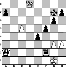 Partie-Notation im PGN-Format [Event "Ende 2014"] [Site "www.mySchach.de"] [Date "2014.12.20"] [Round "1"] [White "Master1"] [Black "Knight"] [ECO "D00"] [WhitemyELO "1421"] [BlackmyELO "1285"] [Result "1/2-1/2"] [TimeControl "10/2592000"] [WhiteDays "076"] [BlackDays "120"] [MySchachNr "97236"] 1. d4 d5 2. e3 Nc6 3. Bd3 Nf6 4. Nf3 Bg4 5. Nbd2 g6 6. O-O Bg7 7. Re1 O-O 8. Qe2 e5 9. e4 dxe4 10. Nxe4 Nd5 11. c4 Ndb4 12. Bd2 Bxf3 13. Qxf3 Nxd4 14. Qe3 Ndc2 15. Bxc2 Nxc2 16. Qe2 Nxa1 17. Rxa1 f5 18. Bg5 Qd4 19. Nd2 Qxb2 20. Rb1 Qxa2 21. Rxb7 e4 22. Rxc7 Bc3 23. Bh6 Rf7 24. Rxf7 Kxf7 25. c5 Bxd2 26. h3 Re8 27. Bxd2 Rd8 28. g3 Rxd2 29. Qb5 Rxf2 30. Qd7+ Kf6 31. Qd8+ Kg7 1/2-1/2 Stellungs-Notation im FEN-Format 3Q4/p5kp/6p1/2P2p2/4p3/6PP/q4r2/6K1 - - - 4 32 Geschlagene Figuren Weiss: Geschlagene Figuren Schwarz: Klicken Sie auf eine geschlagene Figur um den gewünschten Zug darzustellen!