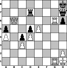 Partie-Notation im PGN-Format [Event "^^Lust, Laune und Spannung am Schach!!!^^"] [Site "www.mySchach.de"] [Date "2007.09.24"] [Round "1"] [White "Naunhofer"] [Black "bruno"] [ECO "B00"] [WhitemyELO "1646"] [BlackmyELO "1483"] [Result "1-0"] [TimeControl "10/864000"] [WhiteDays "39"] [BlackDays "40"] [MySchachNr "38434"] 1. e4 b6 2. Nf3 Bb7 3. Nc3 e6 4. d4 Bb4 5. Bd3 d5 6. e5 h6 7. Bd2 Ne7 8. O-O Nbc6 9. Ne2 O-O 10. c3 Bxc3 11. bxc3 f6 12. exf6 Rxf6 13. Nf4 Qd6 14. Nh5 Rf7 15. Qc2 Nf5 16. Bf4 Qe7 17. Rae1 Bc8 18. Ne5 Nxe5 19. Bxe5 Qg5 20. Ng3 c6 21. a4 a5 22. Nxf5 exf5 23. f4 Qg6 24. Rf3 c5 25. Kh1 c4 26. Be2 Bd7 27. Rg1 Re8 28. g4 Qh7 29. Rfg3 g6 30. Qb2 Re6 31. gxf5 Rxf5 32. Bg4 Rfxe5 33. fxe5 Re7 34. Bxd7 Rxd7 35. Rxg6+ Kh8 36. Qxb6 1-0 Stellungs-Notation im FEN-Format 7k/3r3q/1Q4Rp/p2pP3/P1pP4/2P5/7P/6RK - - - 0 36 Geschlagene Figuren Weiss: Geschlagene Figuren Schwarz: Klicken Sie auf eine geschlagene Figur um den gewünschten Zug darzustellen!