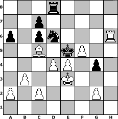 Partie-Notation im PGN-Format [Event "Neujahrsturnier 2007"] [Site "www.mySchach.de"] [Date "2007.01.01"] [Round "1"] [White "Nightflight"] [Black "bernhard"] [ECO "C50"] [WhitemyELO "1560"] [BlackmyELO "1488"] [Result "1-0"] [TimeControl "10/864000"] [WhiteDays "30"] [BlackDays "36"] [MySchachNr "31316"] 1. e4 e5 2. Nf3 Nc6 3. Bc4 h6 4. O-O Nf6 5. Nc3 Bc5 6. d3 d6 7. Na4 Bg4 8. Nxc5 dxc5 9. Bb5 Qd7 10. Nxe5 Bxd1 11. Nxd7 Nxd7 12. Rxd1 O-O 13. Bxc6 bxc6 14. Bf4 Rac8 15. b3 Rfe8 16. Be3 a6 17. f3 f6 18. Re1 Kh7 19. Kf2 Rf8 20. Bf4 g5 21. Be3 Kg6 22. h4 Rh8 23. Rh1 Rce8 24. Rh3 Rh7 25. Rah1 Reh8 26. hxg5 fxg5 27. Ke2 Nf8 28. Rg3 Ne6 29. f4 Kf6 30. f5 Nd4+ 31. Kd2 Nb5 32. Bxc5 Ke5 33. Ke3 Rd8 34. Rxg5 hxg5 35. Rxh7 g4 36. Rh6 Nd6 37. d4# 1-0 Stellungs-Notation im FEN-Format 3r4/2p5/p1pn3R/2B1kP2/3PP1p1/1P2K3/P1P3P1/8 - - - 0 37 Geschlagene Figuren Weiss: Geschlagene Figuren Schwarz: Klicken Sie auf eine geschlagene Figur um den gewünschten Zug darzustellen!