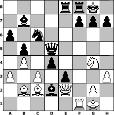 Partie-Notation im PGN-Format [Event "Schach dem Osterhasen IV"] [Site "www.mySchach.de"] [Date "2015.03.29"] [Round "1"] [White "hape50"] [Black "Ziegert"] [ECO "D00"] [WhitemyELO "1330"] [BlackmyELO "1364"] [Result "1-0"] [TimeControl "10/2592000"] [WhiteDays "117"] [BlackDays "000"] [MySchachNr "98720"] 1. d4 d5 2. e3 e6 3. a3 Nf6 4. h3 Be7 5. Nf3 O-O 6. Bd3 c5 7. dxc5 Bxc5 8. O-O Nc6 9. Nbd2 b6 10. b4 Be7 11. Bb2 Bb7 12. Nh2 Qd6 13. Ndf3 e5 14. Bb5 e4 15. Nd2 Bd8 16. f3 Bc7 17. f4 a6 18. Ba4 b5 19. Bb3 Rae8 20. c3 Bb6 21. Kh1 Bxe3 22. Qe2 Bxf4 23. Ng4 Nh5 24. Qd1 Ng3+ 25. Kg1 Nxf1 26. Qxf1 Bxd2 27. Qe2 e3 28. Rd1 d4 29. Bc2 Qd5 30. Rf1 1-0 Stellungs-Notation im FEN-Format 4rrk1/1b3ppp/p1n5/1p1q4/1P1p2N1/P1P1p2P/1BBbQ1P1/5RK1 - - - 3 30 Geschlagene Figuren Weiss: Geschlagene Figuren Schwarz: Klicken Sie auf eine geschlagene Figur um den gewünschten Zug darzustellen!