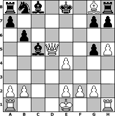 Partie-Notation im PGN-Format [Event "Chess for beginners"] [Site "www.mySchach.de"] [Date "2006.09.27"] [Round "1"] [Board "4"] [White "Nordisch"] [Black "Andylein1989"] [ECO "C21"] [WhitemyELO "1493"] [BlackmyELO "1516"] [Result "1-0"] [TimeControl "10/2592000"] [WhiteDays "30"] [BlackDays "28"] [MySchachNr "28976"] 1. e4 e5 2. d4 exd4 3. c3 dxc3 4. Bc4 c6 5. Qb3 Qf6 6. Nxc3 Bc5 7. Nf3 b6 8. Bg5 Qg6 9. h4 f6 10. h5 Qxg5 11. Nxg5 fxg5 12. Bxg8 d5 13. Nxd5 cxd5 14. Qxd5 1-0 Stellungs-Notation im FEN-Format rnb1k1Br/p5pp/1p6/2bQ2pP/4P3/8/PP2PPP1/R3K2R - KQkq - 0 14 Geschlagene Figuren Weiss: Geschlagene Figuren Schwarz: Klicken Sie auf eine geschlagene Figur um den gewünschten Zug darzustellen!