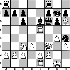 Partie-Notation im PGN-Format [Event "Eine zentrale Er"] [Site "www.mySchach.de"] [Date "2009.05.20"] [Round "2"] [White "kari6katz"] [Black "Juliette2103"] [ECO "C67"] [WhitemyELO "1635"] [BlackmyELO "1498"] [Result "1-0"] [TimeControl "10/2592000"] [WhiteDays "60"] [BlackDays "10"] [MySchachNr "55937"] 1. e4 e5 2. Nf3 Nc6 3. Bb5 Nf6 4. O-O Nxe4 5. Re1 Nd6 6. Bxc6 dxc6 7. Nxe5 Be7 8. d3 O-O 9. Nc3 Be6 10. h3 Bf6 11. Qh5 Bxe5 12. Rxe5 Qf6 13. Bd2 Nf5 14. Re1 g6 15. Qf3 Kg7 16. g4 Nh4 17. Bh6+ 1-0 Stellungs-Notation im FEN-Format r4r2/ppp2pkp/2p1bqpB/4R3/6Pn/2NP1Q1P/PPP1PP2/4R1K1 - - - 2 17 Geschlagene Figuren Weiss: Geschlagene Figuren Schwarz: Klicken Sie auf eine geschlagene Figur um den gewünschten Zug darzustellen!
