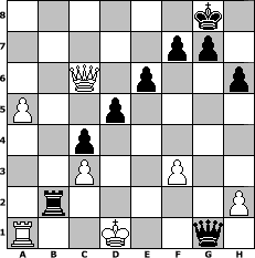 Partie-Notation im PGN-Format [Event "mal so"] [Site "www.mySchach.de"] [Date "2013.12.02"] [Round "1"] [White "reisender"] [Black "Duschgel"] [ECO "B12"] [WhitemyELO "1403"] [BlackmyELO "1583"] [Result "0-1"] [TimeControl "10/1728000"] [WhiteDays "20"] [BlackDays "20"] [MySchachNr "91448"] 1. e4 c6 2. d4 d5 3. e5 c5 4. Nf3 Nc6 5. Bb5 Bd7 6. O-O cxd4 7. Bxc6 bxc6 8. Qxd4 e6 9. Nc3 c5 10. Qf4 Ne7 11. Ne2 Ng6 12. Qe3 Be7 13. c3 Bb5 14. Re1 O-O 15. b3 Qa5 16. Bd2 c4 17. b4 Qc7 18. Ned4 Bd7 19. a4 a6 20. a5 Rfc8 21. Reb1 h6 22. b5 axb5 23. Nxb5 Bxb5 24. Rxb5 Bc5 25. Qe1 Rcb8 26. Qb1 Rxb5 27. Qxb5 Rb8 28. Qa4 Nxe5 29. Bf4 Nxf3+ 30. gxf3 Qxf4 31. Qc6 Bxf2+ 32. Kxf2 Rb2+ 33. Ke1 Qe3+ 34. Kd1 Qg1# 0-1 Stellungs-Notation im FEN-Format 6k1/5pp1/2Q1p2p/P2p4/2p5/2P2P2/1r5P/R2K2q1 - - - 5 35 Geschlagene Figuren Weiss: Geschlagene Figuren Schwarz: Klicken Sie auf eine geschlagene Figur um den gewünschten Zug darzustellen!