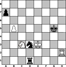 Partie-Notation im PGN-Format [Event "Es weihnachtet sehr"] [Site "www.mySchach.de"] [Date "2021.12.20"] [Round "1"] [White "lotchi"] [Black "skuehnel"] [ECO "D00"] [WhitemyELO "1223"] [BlackmyELO "1270"] [Result "1-0"] [TimeControl "10/864000"] [WhiteDays "10"] [BlackDays "10"] [MySchachNr "123938"] 1. d4 d5 2. e4 e6 3. e5 c5 4. dxc5 Bxc5 5. Be3 Qb6 6. b3 Nc6 7. Bxc5 Qxc5 8. c3 Nxe5 9. f4 Nc6 10. b4 Qd6 11. g3 e5 12. Bg2 exf4 13. gxf4 Qxf4 14. Ne2 Qe3 15. Qxd5 Bg4 16. Qd2 Qe5 17. h3 Rd8 18. Qc2 Qe3 19. hxg4 Nf6 20. Bxc6+ bxc6 21. Rg1 O-O 22. Qc1 Qxc1+ 23. Nxc1 Rfe8+ 24. Ne2 Re4 25. Nd2 Nxg4 26. Nxe4 Ne3 27. Rc1 f5 28. Nc5 Re8 29. a4 Ng4 30. b5 cxb5 31. Rb1 f4 32. Rg3 fxg3 33. axb5 g2 34. Kd2 Rf8 35. c4 Rf1 36. Rb3 Ne5 37. Rg3 Nxc4+ 38. Kd3 Nb2+ 39. Ke4 h5 40. Rxg2 h4 41. Ne6 h3 42. Rxg7+ Kh8 43. Rg3 h2 44. Rh3+ Kg8 45. Rxh2 Re1 46. Kd5 Rd1+ 47. Ke4 Kf7 48. Ng5+ Kf6 49. Kf4 Nd3+ 50. Ke3 Kxg5 51. Nc3 1-0 Stellungs-Notation im FEN-Format 8/p7/8/1P4k1/8/2NnK3/7R/3r4 - - - 1 51 Geschlagene Figuren Weiss: Geschlagene Figuren Schwarz: Klicken Sie auf eine geschlagene Figur um den gewünschten Zug darzustellen!