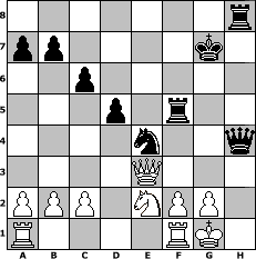 Partie-Notation im PGN-Format [Event "Fruehlingsgefuehle"] [Site "www.mySchach.de"] [Date "2007.03.30"] [Round "2"] [White "Nightflight"] [Black "Fighter"] [ECO "B06"] [WhitemyELO "1691"] [BlackmyELO "1773"] [Result "0-1"] [TimeControl "10/864000"] [WhiteDays "00"] [BlackDays "29"] [MySchachNr "33878"] 1. e4 g6 2. d4 Bg7 3. Nc3 d6 4. Nf3 Nf6 5. Bg5 O-O 6. Be2 c6 7. O-O h6 8. Bf4 Nbd7 9. Bd2 e5 10. dxe5 Nxe5 11. Qc1 Nxf3+ 12. Bxf3 g5 13. h4 Nh7 14. Be2 f5 15. Bc4+ Kh8 16. hxg5 Nxg5 17. exf5 d5 18. Bd3 Bxf5 19. Bxf5 Rxf5 20. Ne2 Ne4 21. Bxh6 Qh4 22. Bxg7+ Kxg7 23. Qe3 Rh8 0-1 Stellungs-Notation im FEN-Format 7r/pp4k1/2p5/3p1r2/4n2q/4Q3/PPP1NPP1/R4RK1 - - - 2 24 Geschlagene Figuren Weiss: Geschlagene Figuren Schwarz: Klicken Sie auf eine geschlagene Figur um den gewünschten Zug darzustellen!