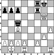 Partie-Notation im PGN-Format [Event "Sweety Tunier"] [Site "www.mySchach.de"] [Date "2006.02.28"] [Round "2"] [White "Knight"] [Black "Fussel"] [ECO "D00"] [WhitemyELO "1206"] [BlackmyELO "1461"] [Result "1-0"] [TimeControl "10/2592000"] [WhiteDays "85"] [BlackDays "60"] [MySchachNr "23041"] 1. d4 d5 2. e4 Nc6 3. Nc3 e5 4. exd5 Nxd4 5. Be3 Nf5 6. Qe2 Nf6 7. Bg5 Nd4 8. Qxe5+ Ne6 9. O-O-O Bd6 10. Qe1 O-O 11. dxe6 Bxe6 12. Nf3 h6 13. Bxf6 Qxf6 14. Ne4 Bf4+ 15. Kb1 Qe7 16. g3 Bg5 17. Nexg5 hxg5 18. h4 g4 19. Nd4 Qc5 20. Nxe6 fxe6 21. Qxe6+ Rf7 22. Qxg4 Raf8 23. Bc4 g6 24. Qxg6+ 1-0 Stellungs-Notation im FEN-Format 5rk1/ppp2r2/6Q1/2q5/2B4P/6P1/PPPP1P2/1K1R3R - - - 0 24 Geschlagene Figuren Weiss: Geschlagene Figuren Schwarz: Klicken Sie auf eine geschlagene Figur um den gewünschten Zug darzustellen!