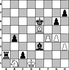 Partie-Notation im PGN-Format [Event "chess960 f"] [Site "www.mySchach.de"] [Date "2007.08.26"] [Round "2"] [White "Ziegert"] [Black "rakl"] [Variant "Fischerrandom"] [SetUp "1"] [FEN "bbrknqnr/pppppppp/8/8/8/8/PPPPPPPP/BBRKNQNR w KQkq - 0 1"] [WhitemyELO "1546"] [BlackmyELO "1500"] [Result "0-1"] [TimeControl "10/1728000"] [WhiteDays "027"] [BlackDays "101"] [MySchachNr "37599"] 1. c4 Ngf6 2. d4 c6 3. e3 b6 4. Nef3 c5 5. d5 e6 6. e4 exd5 7. exd5 Qe7 8. Qd3 Bf4 9. Rc2 Nd6 10. Ne2 Bh6 11. O-O Qe4 12. Qa3 Nxc4 13. Qxa7 Bxd5 14. Qa6 O-O 15. Nc3 Bb7 16. Qb5 Bc6 17. Qb3 Qg4 18. Ne2 Nd2 19. Rxd2 Bxd2 20. h3 Qb4 21. Qc2 Bh6 22. b3 Be4 23. Qd1 Bxb1 24. Qxb1 Ne4 25. Rd1 Rfe8 26. Rd3 Qb5 27. a4 Qc6 28. Ne5 Qe6 29. Rxd7 f6 30. Qxe4 fxe5 31. Rd5 Red8 32. Nc3 Rxd5 33. Qxd5 Qxd5 34. Nxd5 Rd8 35. Nc3 Rd3 36. Kf1 e4 37. g3 g6 38. Ke2 Kf7 39. Nxe4 Rxb3 40. Nd6+ Ke6 41. Nc4 Rb4 42. Kd3 Rxa4 43. Bb2 b5 44. Na3 c4+ 45. Kc2 Ra5 46. f4 Bf8 47. Nb1 b4 48. Bd4 Ra2+ 49. Kc1 c3 50. Be5 Bc5 51. g4 Be3+ 52. Kd1 c2+ 0-1 Stellungs-Notation im FEN-Format 8/7p/4k1p1/4B3/1p3PP1/4b2P/r1p5/1N1K4 - - - 0 53 Geschlagene Figuren Weiss: Geschlagene Figuren Schwarz: Klicken Sie auf eine geschlagene Figur um den gewünschten Zug darzustellen!