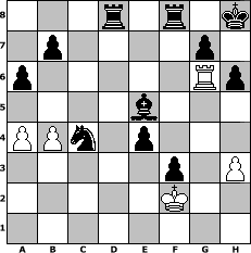 Partie-Notation im PGN-Format [Event "Turnier in den M"] [Site "www.mySchach.de"] [Date "2014.02.19"] [Round "1"] [White "augustus"] [Black "Winston"] [ECO "B20"] [WhitemyELO "1341"] [BlackmyELO "1450"] [Result "0-1"] [TimeControl "10/2592000"] [WhiteDays "12"] [BlackDays "30"] [MySchachNr "93064"] 1. e4 c5 2. Bc4 e6 3. Nf3 a6 4. d3 h6 5. a3 Nc6 6. c3 Nge7 7. Be3 Ng6 8. O-O Be7 9. Nbd2 O-O 10. Bb3 e5 11. Nc4 d6 12. Qd2 f5 13. Qe2 Kh8 14. Ncd2 f4 15. Bxc5 dxc5 16. Nc4 Bg4 17. h3 Bxf3 18. gxf3 Qd7 19. Kh2 Qd8 20. Rg1 Nh4 21. Nd2 Qe8 22. d4 cxd4 23. cxd4 Nxd4 24. Qd1 Bc5 25. Bc4 Rd8 26. b4 Ba7 27. Rg4 Ndxf3+ 28. Kh1 Nxd2 29. Rxh4 Nxe4 30. Qf3 Nd2 31. Qc3 Bxf2 32. Rg4 Bd4 33. Qd3 Bxa1 34. Qg6 Qxg6 35. Rxg6 Nxc4 36. Kg2 f3+ 37. Kf2 e4 38. a4 Be5 0-1 Stellungs-Notation im FEN-Format 3r1r1k/1p4p1/p5Rp/4b3/PPn1p3/5p1P/5K2/8 - - - 1 39 Geschlagene Figuren Weiss: Geschlagene Figuren Schwarz: Klicken Sie auf eine geschlagene Figur um den gewünschten Zug darzustellen!