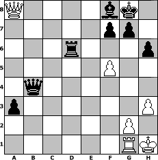 Partie-Notation im PGN-Format [Event "Bremer Schl"] [Site "www.mySchach.de"] [Date "2008.11.01"] [Round "2"] [White "Baehr008"] [Black "Fighter"] [ECO "D18"] [WhitemyELO "1996"] [BlackmyELO "2087"] [Result "0-1"] [TimeControl "10/2592000"] [WhiteDays "162"] [BlackDays "140"] [MySchachNr "49433"] 1. d4 d5 2. c4 c6 3. Nf3 Nf6 4. Nc3 dxc4 5. a4 Bf5 6. e3 e6 7. Bxc4 Bb4 8. O-O Nbd7 9. Qb3 a5 10. Na2 Be7 11. Nh4 Be4 12. Nc3 Bd5 13. Bxd5 Nxd5 14. Qxb7 Bxh4 15. Qxc6 Nb4 16. Qf3 O-O 17. Bd2 Nc5 18. Nb5 Nb3 19. Rad1 Nxd2 20. Rxd2 Rc8 21. Na7 Rc7 22. Nb5 Rc6 23. Na7 Rc5 24. Nb5 Be7 25. Qe2 Rc8 26. Na7 Rb8 27. Nb5 Qd7 28. Rc1 Rfc8 29. Rf1 Rb6 30. h3 Rbc6 31. e4 Bg5 32. Rdd1 Rc2 33. Qh5 h6 34. b3 Na2 35. f4 Be7 36. d5 Nc3 37. Nxc3 R8xc3 38. Rf3 Qa7+ 39. Kh1 Qc5 40. Rxc3 Rxc3 41. Qe2 exd5 42. exd5 Rxb3 43. Kh2 Re3 44. Qb5 Qc2 45. Qb8+ Bf8 46. Rg1 Re2 47. Kh1 Qxa4 48. d6 Rd2 49. Qa8 Rxd6 50. Qf3 Qb4 51. f5 a4 52. Qa8 a3 0-1 Stellungs-Notation im FEN-Format Q4bk1/5pp1/3r3p/5P2/1q6/p6P/6P1/6RK - - - 0 53 Geschlagene Figuren Weiss: Geschlagene Figuren Schwarz: Klicken Sie auf eine geschlagene Figur um den gewünschten Zug darzustellen!