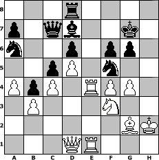 Partie-Notation im PGN-Format [Event "Bremer Schl"] [Site "www.mySchach.de"] [Date "2008.11.01"] [Round "1"] [White "deepsabel"] [Black "muetoe"] [ECO "A57"] [WhitemyELO "1924"] [BlackmyELO "1940"] [Result "1-0"] [TimeControl "10/2592000"] [WhiteDays "84"] [BlackDays "78"] [MySchachNr "49420"] 1. d4 Nf6 2. c4 c5 3. d5 b5 4. a4 b4 5. g3 d6 6. Bg2 g6 7. b3 Bg7 8. Bb2 O-O 9. Nd2 Bf5 10. Ngf3 Qc7 11. O-O Re8 12. Re1 Na6 13. Ra2 Bg4 14. h3 Bc8 15. e4 Nd7 16. Bxg7 Kxg7 17. Nf1 Rb8 18. Rae2 Ne5 19. Nh4 f6 20. f4 Nf7 21. Nf3 Bd7 22. e5 Nh6 23. N1d2 Nf5 24. exf6+ exf6 25. Ne4 Rbd8 26. Kh2 Rxe4 27. Rxe4 h5 28. g4 hxg4 29. hxg4 1-0 Stellungs-Notation im FEN-Format 3r4/p1qb2k1/n2p1pp1/2pP1n2/PpP1RPP1/1P3N2/6BK/3QR3 - - - 0 29 Geschlagene Figuren Weiss: Geschlagene Figuren Schwarz: Klicken Sie auf eine geschlagene Figur um den gewünschten Zug darzustellen!