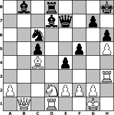 Partie-Notation im PGN-Format [Event "3.FC 960-Clubmeisterschaft 2014"] [Site "www.mySchach.de"] [Date "2014.01.10"] [Round "1"] [White "nyffhans"] [Black "Peterlie77 (C)"] [Variant "Fischerrandom"] [SetUp "1"] [FEN "qbbnnrkr/pppppppp/8/8/8/8/PPPPPPPP/QBBNNRKR w KQkq - 0 1"] [WhitemyELO "2055"] [BlackmyELO "2040"] [Result "1/2-1/2"] [TimeControl "10/2592000"] [WhiteDays "20"] [BlackDays "30"] [MySchachNr "92275"] 1. d4 d5 2. b3 b6 3. c4 c5 4. dxc5 dxc4 5. cxb6 axb6 6. bxc4 Nf6 7. Nf3 Nc6 8. Ne3 Rd8 9. Qb2 O-O 10. h4 Rfe8 11. h5 h6 12. Nd5 Nxd5 13. cxd5 Rxd5 14. Rh4 e5 15. Be4 Rc5 16. Be3 f5 17. Bd3 e4 18. Bxc5 bxc5 19. Bc4+ Kh8 20. Nd2 Qa7 21. Qb5 Qe7 22. Rh3 Bd7 23. Rd1 Rd8 24. Qb1 1/2-1/2 Stellungs-Notation im FEN-Format 1b1r3k/3bq1p1/2n4p/2p2p1P/2B1p3/7R/P2NPPP1/1Q1R2K1 - - - 11 24 Geschlagene Figuren Weiss: Geschlagene Figuren Schwarz: Klicken Sie auf eine geschlagene Figur um den gewünschten Zug darzustellen!