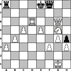 Partie-Notation im PGN-Format [Event "Albspiele 24"] [Site "www.mySchach.de"] [Date "2012.11.07"] [Round "1"] [White "borsti"] [Black "wiesel"] [ECO "C60"] [WhitemyELO "1224"] [BlackmyELO "1172"] [Result "1-0"] [TimeControl "10/1728000"] [WhiteDays "20"] [BlackDays "20"] [MySchachNr "84935"] 1. e4 e5 2. Nf3 Nc6 3. Bb5 Nge7 4. d3 Nd4 5. Nxd4 c6 6. Nf3 d6 7. Ba4 Bd7 8. Nc3 Ng6 9. Be3 Be7 10. h3 O-O 11. O-O Nh4 12. Nxh4 Bxh4 13. Qf3 b5 14. Bb3 a5 15. a3 a4 16. Ba2 Bg5 17. Bxg5 Qxg5 18. Ne2 Be6 19. Bxe6 fxe6 20. Qg3 Qe7 21. c4 bxc4 22. dxc4 c5 23. Nc3 g6 24. Rad1 Rf4 25. f3 Qd8 26. Nb5 Ra6 27. Rf2 Qe7 28. Rfd2 Rf8 29. Rxd6 Rxd6 30. Rxd6 Rc8 31. Qxe5 Kf7 32. Nc3 h5 33. Nb5 Rd8 34. Qxc5 Re8 35. e5 Rb8 36. Qe3 Kg7 37. Qd2 Rc8 38. Qb4 Re8 39. Qxa4 Rc8 40. Qc2 Re8 41. c5 Rb8 42. Nd4 Rc8 43. b4 Kf7 44. g4 h4 45. Qc4 g5 46. Nxe6 Ra8 47. Nxg5+ Ke8 48. Qg8+ Qf8 49. Qg6+ 1-0 Stellungs-Notation im FEN-Format r3kq2/8/3R2Q1/2P1P1N1/1P4Pp/P4P1P/8/6K1 - - - 4 49 Geschlagene Figuren Weiss: Geschlagene Figuren Schwarz: Klicken Sie auf eine geschlagene Figur um den gewünschten Zug darzustellen!
