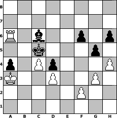 Partie-Notation im PGN-Format [Event "Milde2"] [Site "www.mySchach.de"] [Date "2013.05.17"] [Round "1"] [White "espero"] [Black "sprinterde"] [ECO "A40"] [WhitemyELO "1746"] [BlackmyELO "1701"] [Result "1-0"] [TimeControl "10/3456000"] [WhiteDays "192"] [BlackDays "190"] [MySchachNr "88362"] 1. d4 e6 2. e4 d5 3. Nc3 Bb4 4. exd5 Bxc3+ 5. bxc3 Qxd5 6. Nf3 Nf6 7. c4 Qa5+ 8. Bd2 Qa3 9. Bd3 c5 10. O-O O-O 11. Rb1 Nbd7 12. Rb3 Qxa2 13. Re1 cxd4 14. Bb4 e5 15. Bxf8 Kxf8 16. Nxe5 Nxe5 17. Rxe5 a5 18. Qc1 Qa4 19. Reb5 Bd7 20. Rxb7 Qc6 21. R3b6 Qc8 22. Qb2 Be8 23. Qa3+ Kg8 24. h3 Nd7 25. Rb1 Qc5 26. Qxc5 Nxc5 27. Rb8 Rxb8 28. Rxb8 Kf8 29. Ra8 a4 30. Ra5 Nxd3 31. cxd3 Ke7 32. Kf1 Bc6 33. g3 Kd6 34. Ke2 f6 35. Kd2 g5 36. h4 h6 37. Kc2 Ke6 38. Ra6 Kd6 39. Kb2 Kc5 40. Ka3 1-0 Stellungs-Notation im FEN-Format 8/8/R1b2p1p/2k3p1/p1Pp3P/K2P2P1/5P2/8 - - - 7 40 Geschlagene Figuren Weiss: Geschlagene Figuren Schwarz: Klicken Sie auf eine geschlagene Figur um den gewünschten Zug darzustellen!