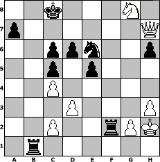 Partie-Notation im PGN-Format [Event "=^^=Spa"] [Site "www.mySchach.de"] [Date "2008.01.26"] [Round "1"] [White "rikilatic"] [Black "bruno"] [ECO "B23"] [WhitemyELO "1475"] [BlackmyELO "1472"] [Result "0-1"] [TimeControl "10/864000"] [WhiteDays "00"] [BlackDays "10"] [MySchachNr "41937"] 1. e4 c5 2. Nc3 Nc6 3. Bb5 d6 4. Bxc6+ bxc6 5. Qf3 Ba6 6. Nh3 h6 7. e5 Rc8 8. e6 fxe6 9. Qh5+ Kd7 10. Nf4 Nf6 11. Qh3 Bc4 12. b3 g5 13. bxc4 gxf4 14. d3 Qa5 15. Bd2 Bg7 16. Ne2 Qa3 17. Nxf4 Nh7 18. Qxe6+ Kd8 19. Rb1 Ng5 20. Qe2 Bc3 21. O-O Bxd2 22. Qxd2 e5 23. Nh5 Kc7 24. Rb3 Qa6 25. Rfb1 Ne6 26. Qd1 Rb8 27. Qf3 Rhf8 28. Qg4 Qxa2 29. h3 Qxb1+ 30. Rxb1 Rxb1+ 31. Kh2 Kd7 32. Qg6 Rxf2 33. Nf6+ Ke7 34. Ng8+ Kd7 35. Qh7+ Kc8 0-1 Stellungs-Notation im FEN-Format 2k3N1/p6Q/2ppn2p/2p1p3/2P5/3P3P/2P2rPK/1r6 - - - 6 36 Geschlagene Figuren Weiss: Geschlagene Figuren Schwarz: Klicken Sie auf eine geschlagene Figur um den gewünschten Zug darzustellen!