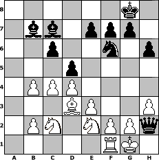 Partie-Notation im PGN-Format [Event "960 zum 1."] [Site "www.mySchach.de"] [Date "2015.11.05"] [Round "1"] [White "mudb"] [Black "Winston"] [Variant "Fischerrandom"] [SetUp "1"] [FEN "rbbqnknr/pppppppp/8/8/8/8/PPPPPPPP/RBBQNKNR w KQkq - 0 1"] [WhitemyELO "1044"] [BlackmyELO "1458"] [Result "0-1"] [TimeControl "10/2592000"] [WhiteDays "76"] [BlackDays "45"] [MySchachNr "101125"] 1. b3 d5 2. d4 h6 3. e3 a6 4. h3 Bd7 5. Ne2 Ngf6 6. c3 Nd6 7. Ba3 Bb5 8. Bd3 Qd7 9. O-O Ba7 10. Bxd6 Qxd6 11. a4 Bc6 12. b4 b5 13. axb5 axb5 14. Ra5 O-O 15. Ra6 Bb6 16. Qa1 Rxa6 17. Qxa6 Ra8 18. Qxa8+ Bxa8 19. Bxb5 c6 20. Bd3 Bb7 21. Nc2 Bc7 22. c4 Qh2# 0-1 Stellungs-Notation im FEN-Format 6k1/1bb1ppp1/2p2n1p/3p4/1PPP4/3BP2P/1PN1NPPq/5RK1 - - - 1 23 Geschlagene Figuren Weiss: Geschlagene Figuren Schwarz: Klicken Sie auf eine geschlagene Figur um den gewünschten Zug darzustellen!