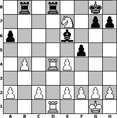 Partie-Notation im PGN-Format [Event "1. Fr"] [Site "www.mySchach.de"] [Date "2009.02.01"] [Round "1"] [White "brucybabe"] [Black "mkauf"] [ECO "C65"] [WhitemyELO "1660"] [BlackmyELO "1520"] [Result "1-0"] [TimeControl "10/864000"] [WhiteDays "28"] [BlackDays "28"] [MySchachNr "52279"] 1. e4 e5 2. Nf3 Nc6 3. Bb5 Nf6 4. O-O Be7 5. Nc3 d6 6. d4 a6 7. Bxc6+ bxc6 8. dxe5 Nd7 9. exd6 cxd6 10. Bf4 Qc7 11. Qd4 O-O 12. Rad1 Ne5 13. Nxe5 dxe5 14. Bxe5 c5 15. Bxc7 cxd4 16. Nd5 Bc5 17. b4 Ba7 18. Bb6 Bxb6 19. Nxb6 Rb8 20. Nd5 Be6 21. Rxd4 Rfd8 22. Rfd1 f5 23. Ne7+ 1-0 Stellungs-Notation im FEN-Format 1r1r2k1/4N1pp/p3b3/5p2/1P1RP3/8/P1P1PPPP/3R2K1 - - - 1 23 Geschlagene Figuren Weiss: Geschlagene Figuren Schwarz: Klicken Sie auf eine geschlagene Figur um den gewünschten Zug darzustellen!
