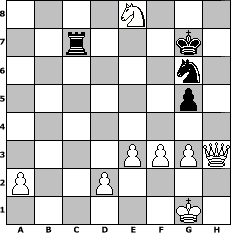 Partie-Notation im PGN-Format [Event "unter uns Nr. 19 (Osterturnier)"] [Site "www.mySchach.de"] [Date "2014.04.17"] [Round "1"] [White "reisinger"] [Black "Schefsche"] [ECO "D08"] [WhitemyELO "1468"] [BlackmyELO "1424"] [Result "1-0"] [TimeControl "10/864000"] [WhiteDays "50"] [BlackDays "22"] [MySchachNr "93978"] 1. d4 d5 2. c4 e5 3. e3 Bb4+ 4. Nc3 Bxc3+ 5. bxc3 dxc4 6. Bxc4 exd4 7. cxd4 Nf6 8. Ba3 Ne4 9. Nf3 c6 10. O-O b5 11. Bd3 Bf5 12. Rc1 Nd6 13. Bxf5 Nxf5 14. Rc5 Ne7 15. Re5 c5 16. Bxc5 Nbc6 17. Bxe7 Nxe7 18. Qd3 a6 19. Qe4 f6 20. Re6 Kf7 21. Rc1 Qd7 22. Rc5 Qxe6 23. Qc2 h5 24. Nh4 Rac8 25. g3 Rxc5 26. dxc5 Rh6 27. Nf3 g5 28. Nd4 Qc4 29. Qe4 Qxc5 30. Qe6+ Kf8 31. Qxa6 h4 32. Ne6+ Ke8 33. Nxc5 hxg3 34. Qxb5+ Kf7 35. hxg3 Kf8 36. Nd7+ Kg7 37. Qb8 Ng6 38. Qd8 Nh8 39. Qf8+ Kh7 40. Nxf6+ Kg6 41. Ng4 Rh7 42. Qf6+ Kh5 43. f3 Ng6 44. Qf5 Rc7 45. Nf6+ Kh6 46. Qh3+ Kg7 47. Ne8+ 1-0 Stellungs-Notation im FEN-Format 4N3/2r3k1/6n1/6p1/8/4PPPQ/P2P4/6K1 - - - 8 47 Geschlagene Figuren Weiss: Geschlagene Figuren Schwarz: Klicken Sie auf eine geschlagene Figur um den gewünschten Zug darzustellen!