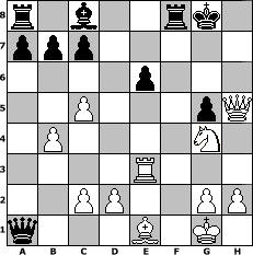 Partie-Notation im PGN-Format [Event "Mikado"] [Site "www.mySchach.de"] [Date "2014.03.15"] [Round "1"] [White "orion"] [Black "sprinterde"] [ECO "A40"] [WhitemyELO "1618"] [BlackmyELO "1674"] [Result "1-0"] [TimeControl "10/2592000"] [WhiteDays "30"] [BlackDays "30"] [MySchachNr "93510"] 1. d4 e6 2. e4 d5 3. exd5 Qxd5 4. Nc3 Bb4 5. Nf3 Nc6 6. Bd3 Nf6 7. O-O Bxc3 8. bxc3 O-O 9. Bg5 Ne8 10. c4 Qd6 11. Re1 h6 12. Bh4 Nb4 13. c5 Qd7 14. Be4 f5 15. a3 g5 16. axb4 fxe4 17. Ne5 Qg7 18. Bg3 Nf6 19. Ra3 Rd8 20. f3 exf3 21. Rxf3 h5 22. Rxf6 Qxf6 23. Qxh5 Rf8 24. Ng4 Qxd4+ 25. Re3 Qa1+ 26. Be1 1-0 Stellungs-Notation im FEN-Format r1b2rk1/ppp5/4p3/2P3pQ/1P4N1/4R3/2PP2PP/q3B1K1 - - - 3 26 Geschlagene Figuren Weiss: ![]() ![]() ![]() ![]() ![]() ![]() ![]() ![]() ![]() ![]() ![]() ![]() ![]() ![]() ![]() Geschlagene Figuren Schwarz: ![]() ![]() ![]() ![]() ![]() ![]() ![]() ![]() ![]() ![]() ![]() ![]() ![]() ![]() ![]() Klicken Sie auf eine geschlagene Figur um den gewünschten Zug darzustellen!