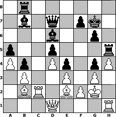 Partie-Notation im PGN-Format [Event "3.FC 960-Clubmeisterschaft 2014"] [Site "www.mySchach.de"] [Date "2014.01.10"] [Round "1"] [White "nyffhans"] [Black "Erich"] [Variant "Fischerrandom"] [SetUp "1"] [FEN "qbbnnrkr/pppppppp/8/8/8/8/PPPPPPPP/QBBNNRKR w KQkq - 0 1"] [WhitemyELO "2055"] [BlackmyELO "2048"] [Result "1/2-1/2"] [TimeControl "10/2592000"] [WhiteDays "18"] [BlackDays "30"] [MySchachNr "92265"] 1. d4 d5 2. b3 b6 3. c4 Ne6 4. Nf3 Nf6 5. Ne3 c6 6. cxd5 cxd5 7. Ba3 Re8 8. g3 Qb7 9. h4 h5 10. Qb2 Ng4 11. Qd2 g6 12. Rc1 Qd7 13. Bd3 Bb7 14. Bb2 Bd6 15. Nxg4 hxg4 16. Ne1 Ng7 17. Ng2 Rd8 18. Rc2 Rb8 19. Qc1 b5 20. Nf4 Nh5 21. Nxh5 Rxh5 22. a3 a5 23. Kg2 e5 24. e3 e4 25. Be2 b4 26. a4 Kg7 27. Qd1 1/2-1/2 Stellungs-Notation im FEN-Format 1r6/1b1q1pk1/3b2p1/p2p3r/Pp1Pp1pP/1P2P1P1/1BR1BPK1/3Q3R - - - 2 27 Geschlagene Figuren Weiss: Geschlagene Figuren Schwarz: Klicken Sie auf eine geschlagene Figur um den gewünschten Zug darzustellen!