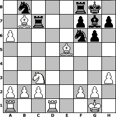 Partie-Notation im PGN-Format [Event "Advents-Schach 2011"] [Site "www.mySchach.de"] [Date "2011.11.27"] [Round "1"] [White "bane"] [Black "nogumo"] [ECO "A16"] [WhitemyELO "1942"] [BlackmyELO "1708"] [Result "1-0"] [TimeControl "10/2592000"] [WhiteDays "30"] [BlackDays "30"] [MySchachNr "77762"] 1. c4 Nf6 2. Nc3 g6 3. e4 d6 4. d4 Bg7 5. Nf3 O-O 6. Be2 c6 7. O-O Bg4 8. h3 Bxf3 9. Bxf3 Nbd7 10. Qe2 a6 11. Be3 b5 12. e5 dxe5 13. Bxc6 Rc8 14. cxb5 exd4 15. Bxd4 Nb8 16. Rfd1 Qa5 17. Bb7 Rc7 18. bxa6 e5 19. Qxe5 Qxe5 20. Bxe5 1-0 Stellungs-Notation im FEN-Format 1n3rk1/1Br2pbp/P4np1/4B3/8/2N4P/PPP2PP1/R2R2K1 - - - 0 20 Geschlagene Figuren Weiss: Geschlagene Figuren Schwarz: Klicken Sie auf eine geschlagene Figur um den gewünschten Zug darzustellen!
