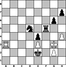 Partie-Notation im PGN-Format [Event "1. Weltmeisterschaft @ myschach.de"] [Site "www.mySchach.de"] [Date "2006.09.15"] [Round "1"] [White "MartinSilies"] [Black "Bauer91"] [ECO "B07"] [WhitemyELO "1547"] [BlackmyELO "1495"] [Result "0-1"] [TimeControl "10/2592000"] [WhiteDays "091"] [BlackDays "141"] [MySchachNr "28475"] 1. e4 d6 2. d4 g6 3. Nf3 Bg7 4. c3 Bg4 5. h3 Bxf3 6. Qxf3 c6 7. Bc4 f6 8. O-O Nh6 9. Bxh6 Bxh6 10. e5 fxe5 11. Qf7+ Kd7 12. dxe5 Kc8 13. Be6+ Kc7 14. Rd1 d5 15. Bxd5 cxd5 16. Rxd5 Qe8 17. Rc5+ Nc6 18. Qc4 e6 19. b4 a6 20. Na3 Bf8 21. Ra5 Kb8 22. Ra4 Nxe5 23. Qd4 Nf7 24. b5 axb5 25. Rxa8+ Kxa8 26. Nc2 e5 27. Qb6 Qc6 28. Qxc6 bxc6 29. a4 Kb7 30. axb5 cxb5 31. Ne3 Bc5 32. Rb1 Kc6 33. Kf1 Ra8 34. c4 Bxe3 35. cxb5+ Kb6 36. fxe3 Rc8 37. Ke2 Rc2+ 38. Kf3 Rc5 39. Rd1 Kxb5 40. Rd7 Ng5+ 41. Kg4 Ne4 42. Kf3 Nf6 43. Rf7 e4+ 44. Kg3 Rf5 45. Rb7+ Kc4 46. h4 Kd3 47. Rb3+ Ke2 48. Ra3 Nd5 0-1 Stellungs-Notation im FEN-Format 8/7p/6p1/3n1r2/4p2P/R3P1K1/4k1P1/8 - - - 5 49 Geschlagene Figuren Weiss: ![]() ![]() ![]() ![]() ![]() ![]() ![]() ![]() ![]() ![]() ![]() ![]() ![]() ![]() ![]() Geschlagene Figuren Schwarz: ![]() ![]() ![]() ![]() ![]() ![]() ![]() ![]() ![]() ![]() ![]() ![]() ![]() ![]() ![]() Klicken Sie auf eine geschlagene Figur um den gewünschten Zug darzustellen!