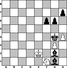 Partie-Notation im PGN-Format [Event "Open II"] [Site "www.mySchach.de"] [Date "2016.03.11"] [Round "1"] [White "Naunhofer"] [Black "Helmut48"] [ECO "A46"] [WhitemyELO "1653"] [BlackmyELO "2003"] [Result "0-1"] [TimeControl "10/1728000"] [WhiteDays "117"] [BlackDays "118"] [MySchachNr "102872"] 1. d4 Nf6 2. Nf3 d5 3. c4 e6 4. Nc3 Be7 5. e3 O-O 6. Be2 dxc4 7. Bxc4 a6 8. O-O b5 9. Be2 b4 10. Nb1 Bb7 11. Nbd2 c5 12. b3 cxd4 13. Nxd4 Qc7 14. Bf3 Nbd7 15. Bb2 Rac8 16. Rc1 Nc5 17. Qe2 Nd5 18. Ne4 Qa5 19. h3 Nxe4 20. Bxe4 Nc3 21. Bxc3 Bxe4 22. Ba1 Qg5 23. Nf3 Qh5 24. Rxc8 Rxc8 25. Qxa6 Ra8 26. Qe2 f6 27. Nd4 Qxe2 28. Nxe2 Rxa2 29. Nd4 e5 30. Nf3 Bc2 31. Rc1 Bxb3 32. Ne1 Be6 33. f4 exf4 34. exf4 b3 35. Bd4 Re2 36. Kf1 b2 37. Rb1 Bc4 38. Kg1 Ba3 39. Bxb2 Bxb2 40. Nf3 Bd3 41. Re1 Rxe1+ 42. Nxe1 Bd4+ 43. Kh2 Be4 44. Kg3 Kf7 45. Nf3 Be3 46. Nh2 Ke6 47. Ng4 Bd2 48. Kf2 Bxf4 49. g3 Bc7 50. Nh2 Bb6+ 51. Ke2 Bg2 52. h4 Kf5 53. Ke1 Bg1 54. Nf1 g6 55. Ke2 Kg4 0-1 Stellungs-Notation im FEN-Format 8/7p/5pp1/8/6kP/6P1/4K1b1/5Nb1 - - - 2 56 Geschlagene Figuren Weiss: Geschlagene Figuren Schwarz: Klicken Sie auf eine geschlagene Figur um den gewünschten Zug darzustellen!