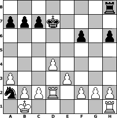 Partie-Notation im PGN-Format [Event "Schach in den Mai"] [Site "www.mySchach.de"] [Date "2008.04.26"] [Round "1"] [White "Andylein1989"] [Black "Steppenwolf"] [ECO "A00"] [WhitemyELO "1411"] [BlackmyELO "1236"] [Result "1-0"] [TimeControl "10/864000"] [WhiteDays "26"] [BlackDays "21"] [MySchachNr "44539"] 1. c3 Nc6 2. d4 d5 3. Nf3 Nf6 4. Bg5 Bg4 5. e3 e5 6. Be2 Bxf3 7. Bxf3 h6 8. Bxf6 gxf6 9. Nd2 Bd6 10. Bxd5 exd4 11. Qh5 Qe7 12. cxd4 O-O-O 13. Qxf7 Qxf7 14. Bxf7 Rd7 15. Be6 Bb4 16. Bxd7+ Kxd7 17. O-O-O Bxd2+ 18. Rxd2 Nb4 19. a3 Na2+ 20. Kb1 1-0 Stellungs-Notation im FEN-Format 7r/pppk4/5p1p/8/3P4/P3P3/nPPR1PPP/1K5R - - - 2 20 Geschlagene Figuren Weiss: Geschlagene Figuren Schwarz: Klicken Sie auf eine geschlagene Figur um den gewünschten Zug darzustellen!