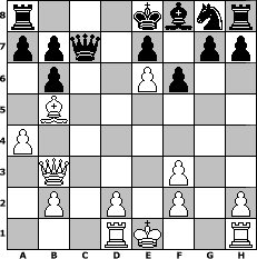 Partie-Notation im PGN-Format [Event "Wanderpokal August 2006"] [Site "www.mySchach.de"] [Date "2006.08.05"] [Round "1"] [White "torsten64"] [Black "Master1"] [ECO "D06"] [WhitemyELO "2029"] [BlackmyELO "2394"] [Result "1-0"] [TimeControl "10/86400"] [WhiteDays "02"] [BlackDays "02"] [MySchachNr "27484"] 1. d4 d5 2. c4 Nf6 3. cxd5 Nxd5 4. Nf3 Bg4 5. e4 Nf6 6. Nc3 Bxf3 7. gxf3 Nbd7 8. e5 Ng8 9. Qb3 Nb6 10. e6 f6 11. a4 Qxd4 12. Be3 Qd6 13. Nb5 Qd8 14. Bxb6 cxb6 15. Rd1 Qc8 16. Nc7+ Qxc7 17. Bb5+ 1-0 Stellungs-Notation im FEN-Format r3kbnr/ppq1p1pp/1p2Pp2/1B6/P7/1Q3P2/1P1P1P1P/3RK2R - Kkq - 1 17 Geschlagene Figuren Weiss: Geschlagene Figuren Schwarz: Klicken Sie auf eine geschlagene Figur um den gewünschten Zug darzustellen!