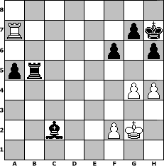 | Partie-Notation im PGN-Format [Event "Schach Master"] [Site "www.mySchach.de"] [Date "2004.07.16"] [Round "1"] [White "tschulz"] [Black "Joschi"] [ECO "A00"] [WhitemyELO "1353"] [BlackmyELO "1535"] [Result "0-1"] [TimeControl "10/864000"] [WhiteDays "44"] [BlackDays "41"] [MySchachNr "5715"] 1. b4 d5 2. Bb2 Bf5 3. b5 c6 4. a4 Nd7 5. d4 Ngf6 6. e3 e6 7. Nd2 c5 8. c4 cxd4 9. exd4 dxc4 10. Bxc4 Rc8 11. Qf3 Bb4 12. Bc3 Bxc3 13. Qxc3 Nb6 14. Ngf3 Bg4 15. Ne5 Bf5 16. O-O O-O 17. Rfc1 Nxc4 18. Ndxc4 Ne4 19. Qb4 Qxd4 20. Ra2 Rfd8 21. Rac2 f6 22. Nf3 Qd7 23. Ne3 Rxc2 24. Nxc2 Rc8 25. Nfd4 Bg6 26. Re1 e5 27. Qb3+ Bf7 28. Qb2 exd4 29. Rxe4 d3 30. Nd4 Bg6 31. Rf4 Qd6 32. g3 Qc5 33. Nb3 Qc2 34. Qxc2 dxc2 35. Kg2 c1=Q 36. Nxc1 Rxc1 37. Rd4 h6 38. Rd8+ Kh7 39. Rd7 Rc4 40. a5 Rc5 41. a6 Rxb5 42. h4 bxa6 43. Rxa7 a5 44. g4 Bc2 0-1 Stellungs-Notation im FEN-Format 8/R5pk/5p1p/pr6/6PP/8/2b2PK1/8 - - - 1 45 Geschlagene Figuren Weiss:                              Geschlagene Figuren Schwarz:                               Klicken Sie auf eine geschlagene Figur um den gewünschten Zug darzustellen!