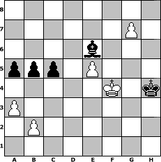 Partie-Notation im PGN-Format [Event "Clubmeisterschaft"] [Site "www.mySchach.de"] [Date "2014.01.19"] [Round "1"] [White "martinus"] [Black "woern63"] [ECO "D30"] [WhitemyELO "1788"] [BlackmyELO "1932"] [Result "0-1"] [TimeControl "10/2592000"] [WhiteDays "145"] [BlackDays "133"] [MySchachNr "92409"] 1. d4 d5 2. c4 e6 3. cxd5 exd5 4. Nc3 c6 5. Nf3 Bd6 6. e4 dxe4 7. Nxe4 Qe7 8. Bd3 f5 9. O-O fxe4 10. Re1 Nf6 11. Bg5 O-O 12. Rxe4 Qf7 13. Rh4 g6 14. Qd2 Be6 15. Ne5 Bxe5 16. dxe5 Nd5 17. Bh6 Re8 18. f4 Na6 19. g4 Rad8 20. f5 Ndb4 21. fxg6 Qe7 22. gxh7+ Kh8 23. Bg5 Qc5+ 24. Qf2 Qxf2+ 25. Kxf2 Nxd3+ 26. Ke3 Rf8 27. Rd1 Nab4 28. Bxd8 Rxd8 29. g5 Nc2+ 30. Ke2 Nd4+ 31. Rxd4 Rxd4 32. Ke3 Rd5 33. Rxd3 Rxd3+ 34. Kxd3 Kxh7 35. a3 Kg6 36. h4 Kh5 37. Ke4 Kxh4 38. Kf4 c5 39. g6 b5 40. g7 a5 0-1 Stellungs-Notation im FEN-Format 8/6P1/4b3/ppp1P3/5K1k/P7/1P6/8 - - - 0 41 Geschlagene Figuren Weiss: Geschlagene Figuren Schwarz: Klicken Sie auf eine geschlagene Figur um den gewünschten Zug darzustellen!